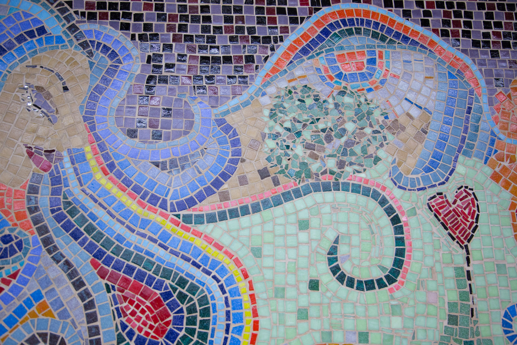Inglewood Genesis is a mosaic tile mural based on drawings made by youth at the Lockhaven Community Center, a city recreational facility. The mural is comprised of thousands of tiny glass tiles from Venice, Italy set into mortar. The artist assembled drawings from these diverse youths into a coherent whole, and taught them how to work with the mosaic tiles. The mosaic tiles, cut in 2000, were not assembled. In 2013 art conservator Duane Chartier assembled and installed the work.