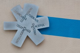 Five vibrant lines create literal pathways to the aluminum medallions holding the youth’s affirmations. These undulating paths cross, collide, overlap and embrace as they climb to the heights of individuality, inspiration and creative success. The youth provided the words Dream, Inspiration, Kindness, Respect, Shine, Support, Vision and Work Hard. They cast positive community values with energetic graffiti gestures onto the community architecture.