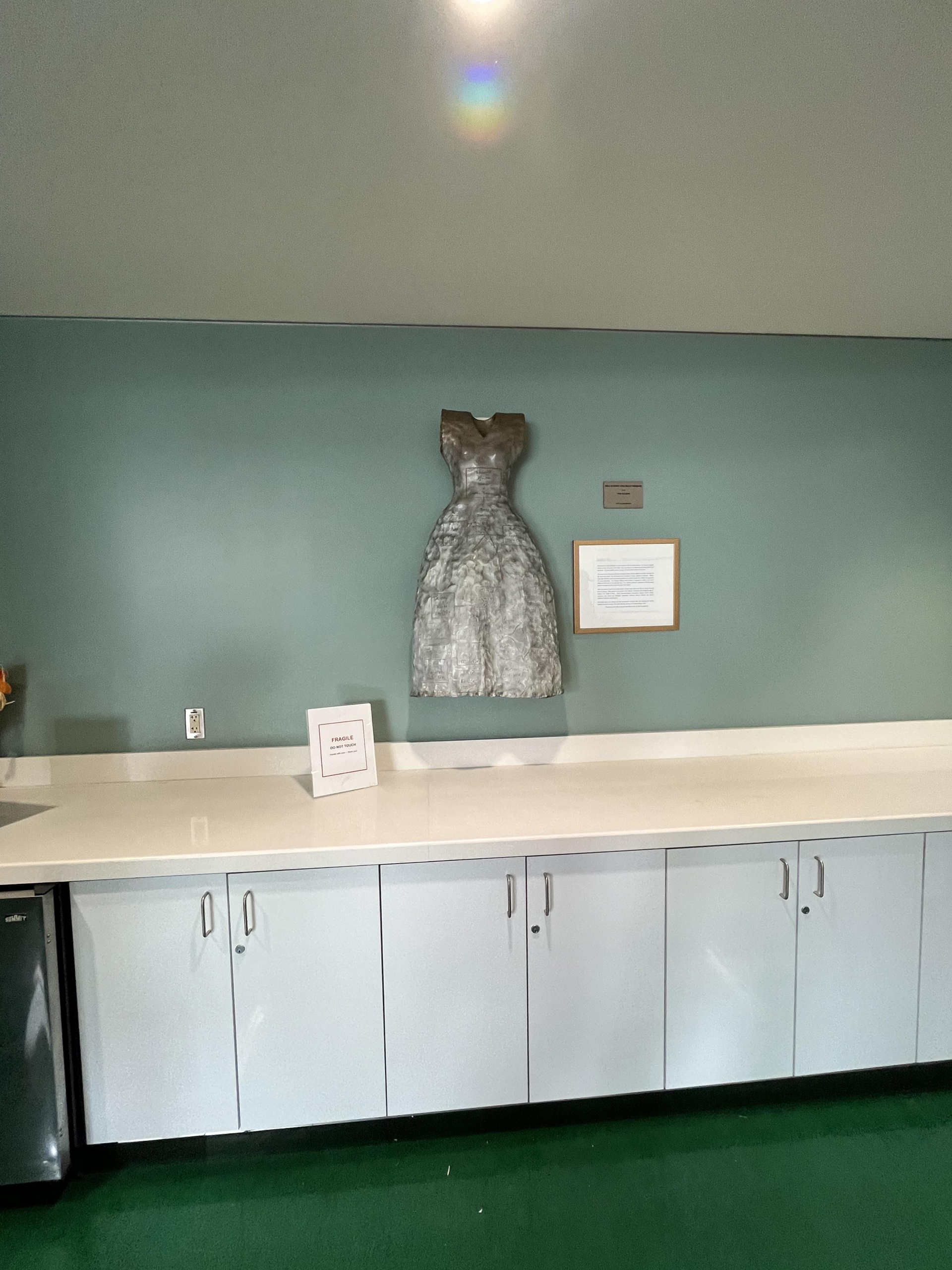 Self Evident (for Sally Hemings), a sculpture by Tori Ellison, explores American diversity through a dress. The sculpture holds the family tree of the enslaved Hemings, her half-sister Martha Wayles Skelton and Sally’s master President Thomas Jefferson. Hemings and Skelton had the same white father. Jefferson married Martha and took Sally as a household slave.