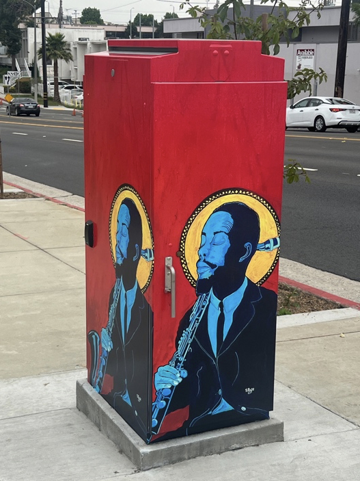 The Utility Box Project is a multiple part, multiple site community artwork exploring Inglewood’s cultural achievements in the arts, entertainment, history and sports. Original works by contemporary Black painters Rasta Asaru Escott EL, Patrick Henry Johnson, Mike Norice and Sam Pace were scanned and digitally modified to create eight motifs wrapped onto sixteen sidewalk-mounted electrical utility boxes. The artworks are mounted on city-owned boxes along arterials in each of Inglewood’s four council districts on sixteen locations across the nine square miles of the city. The Creative House Gallery exhibited the original artworks in downtown Inglewood during summer 2024.